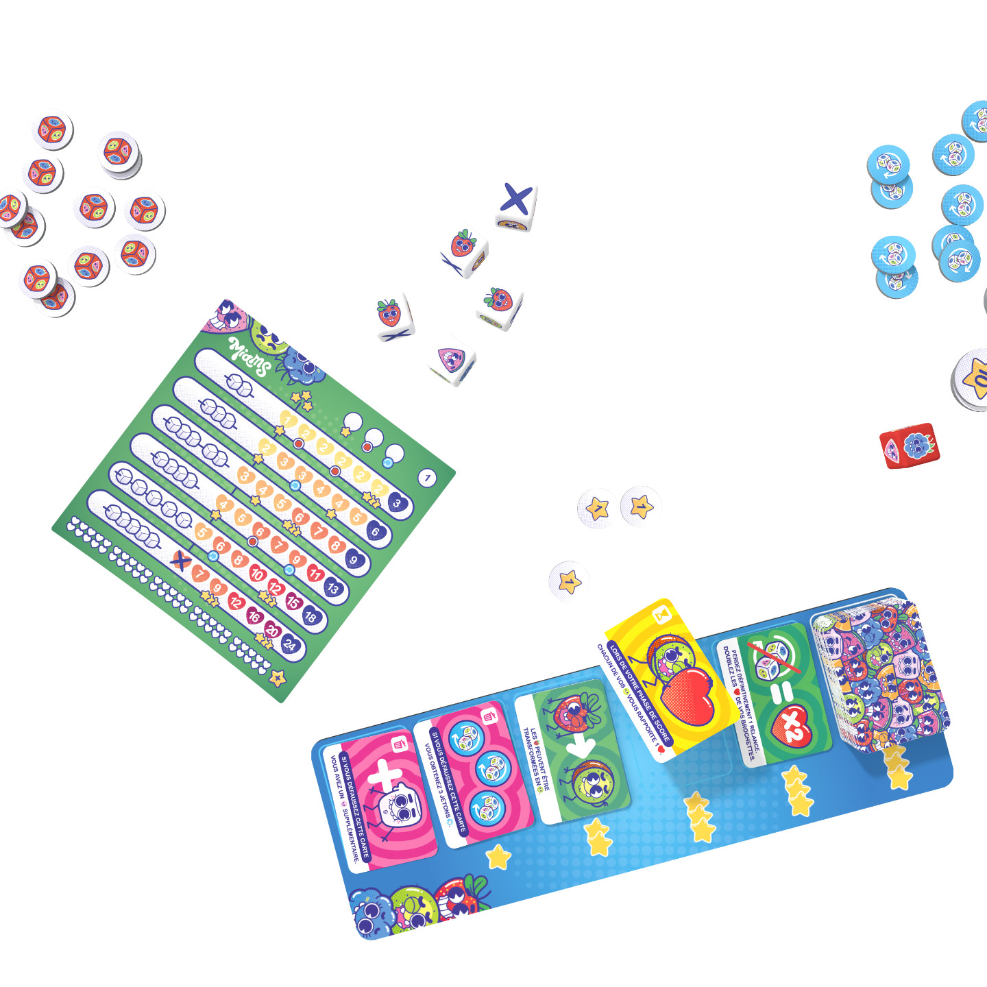 Cette sorcellerie, on la doit à Jules Messaud, dont l’Akropolis, malgré son succès, m’avait laissé de marbre. Ici, loin de rester sur les berges tranquilles d’une créativité sage, il a décidé de se lâcher, et ça fait du bien. L’idée générale ? Un Yam's survitaminé, dans lequel les joueurs récupèrent tous un pouvoir surpété chaque tour.Un tour est donc bête comme tout : on lance ses dés, on utilise une relance gratuite pour ce qui ne nous convient pas, et on marque des points en fonction de la « brochette » obtenue (paire, brelan, full, suite de fruits similaire, cinq fruits différents), puis on achète une carte pouvoir sur une rivière ou, si l’on ne possède pas assez d’étoiles (la monnaie du jeu, qui ajoute aussi des points à la fin), on récupère le pouvoir gratos, il y en a toujours un car les cartes de la rivière coulissent.