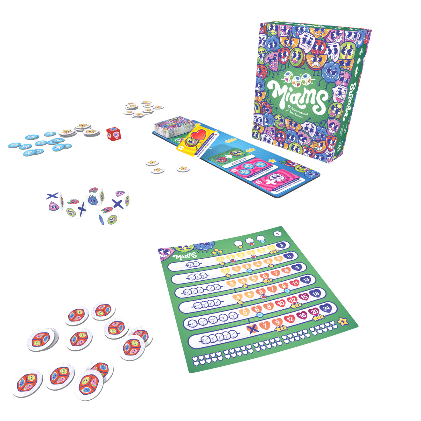 Dès ma première partie, je savais que Miams était fun, que je l’aimerais et qu’il serait très facile à sortir. Ce que j’attendais moins, c’est découvrir au bout d’une centaine qu’il ne me lassait absolument pas. Car, sous ses airs de fête du slip de pouvoirs abusés, il révèle une profondeur inattendue. D’abord, car toutes les stratégies se révèlent viables, et que la construction d’un vrai petit tableau de cartes cohérentes, dont les effets se complètent ou se corrigent, devient un vrai jeu dans le jeu, pour atteindre des scores qui semblaient inatteignables au début.Ensuite, car même avec des joueurs plus aguerris, il crée des comportements plus travaillés : observer les combos des autres pour leur damner le pion sur un achat de carte et casser leur élan, jouer le rush (le premier à 50 points déclenche la fin de partie, mais ne l’emporte pas forcément) ou construire plus lentement, mais tout miser sur l’accumulation d’étoiles et scorer comme un cochon à la fin, fabriquer un tableau de pouvoirs de transformation des faces de dés, qui rendent chaque lancer presque anecdotique tant on en fait ensuite ce que l’on veut, etc. Il y a mille approches possibles et tout dépend de la table, du hasard de la rivière, des risques que l’on est prêt à prendre.